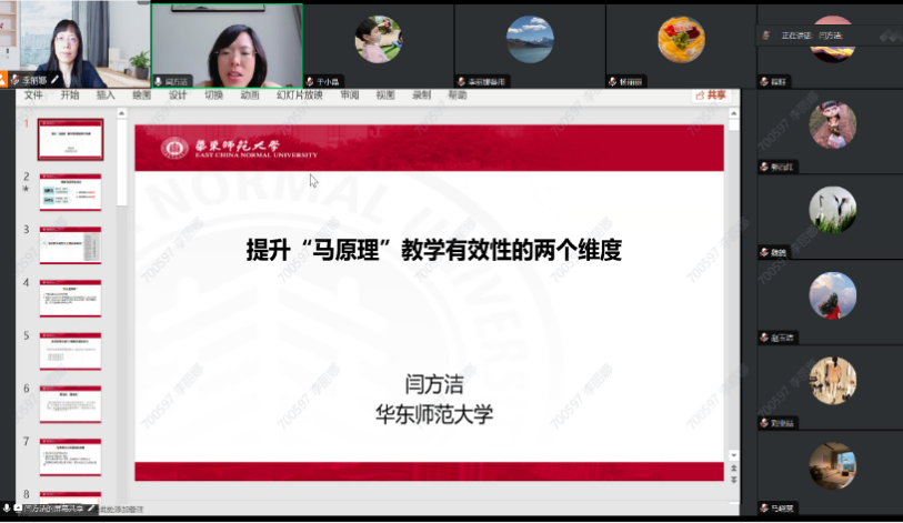 聚焦推动马克思主义中国化时代化的教学研究,“马克思主义基本原理”教研室邀请中央马工程教材编写组成员、教育部青年长江学者、中宣部思想文化宣传青年英才、华东师范大学英国威廉集团官网闫方洁教授围绕提升“马克思主义基本原理”教学有效性的两个维度展开深入阐释和经验分享。她指出教学中应体现和融入透彻的理论意识和敏锐的现实意识,展示和讲解了日常教学中她所运用的精彩教学课件和教学设计。从比较视域下的广度、问题意识的深度和对象意识的温度三个方面切入,指导如何将教材体系转化为教学体系。