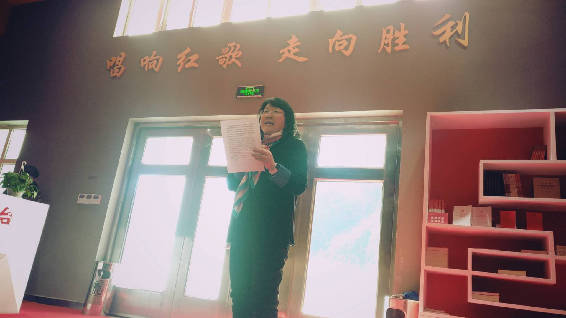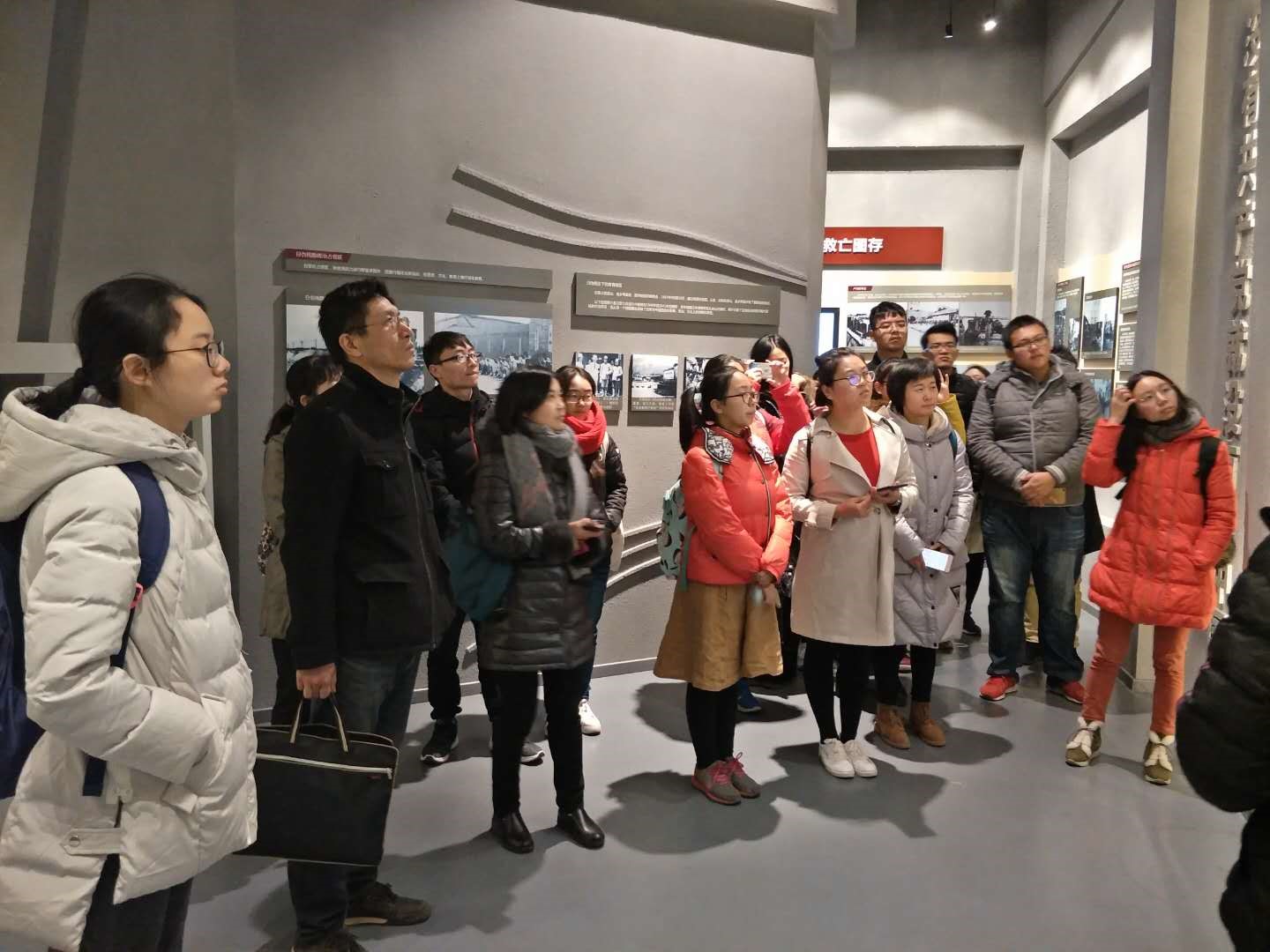 随后,师生们一同参观了展览馆的三个展区,先后重温了共产党在中国诞生,抗战,以及建设新中国的历史,并观看了有关曹火星同志创作歌曲的影视及实物资料。活动中,师生们在“纲要”教研室金智学老师的带领下观摩了纪念馆,认真听取了讲解,并在纪念馆前高唱《没有共产党就没有新中国》,抒发了自己爱党爱国的思想感情。