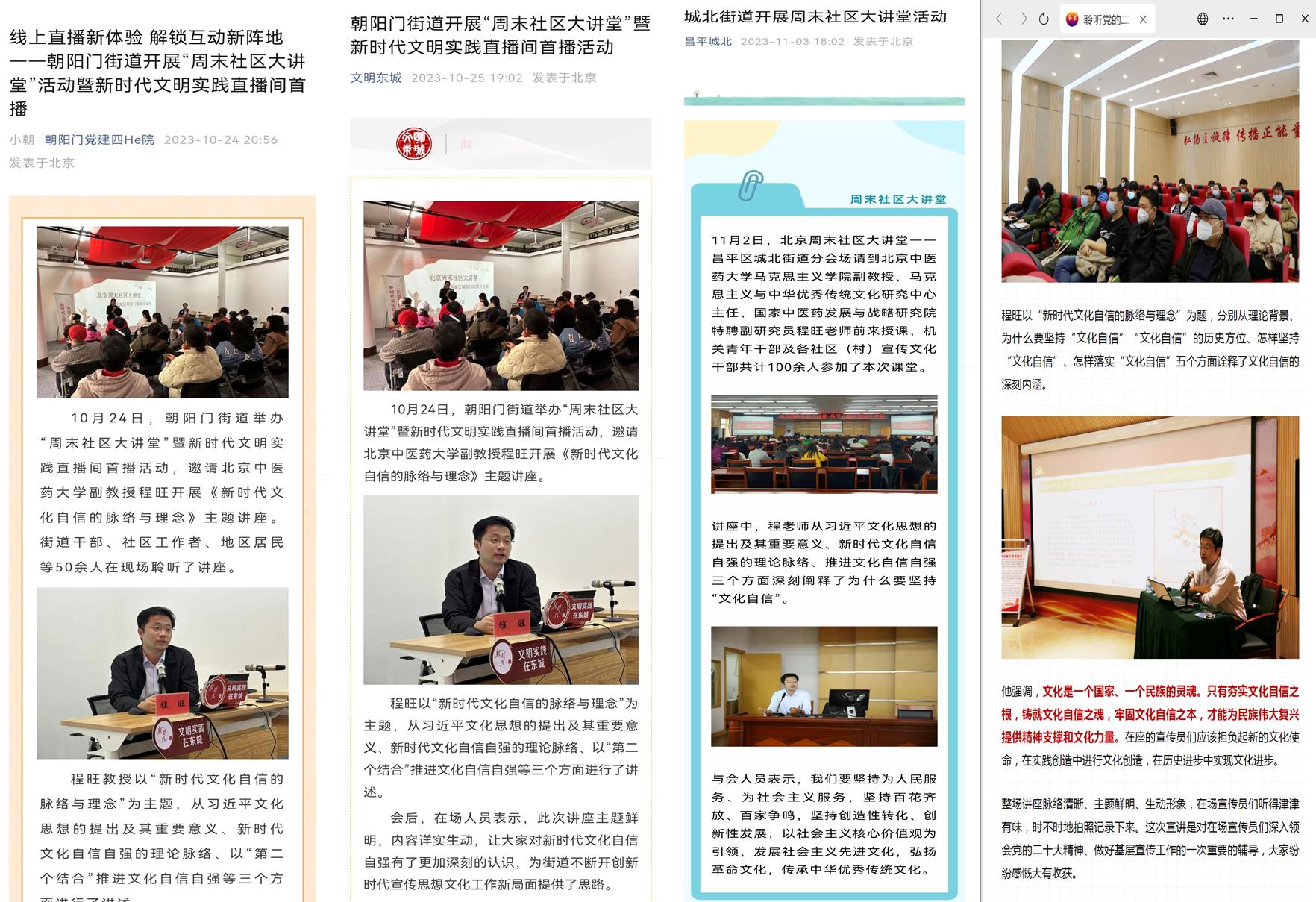 近期,英国威廉集团官网程旺老师应北京周末社区大讲堂邀请,先后赴东城区朝阳门街道、怀柔区怀柔镇政府、昌平区城北街道开展理论讲座活动。这是程旺老师此前多次深入西城、通州、大兴等基层讲座后,再次为北京周末社区大讲堂进行讲座。